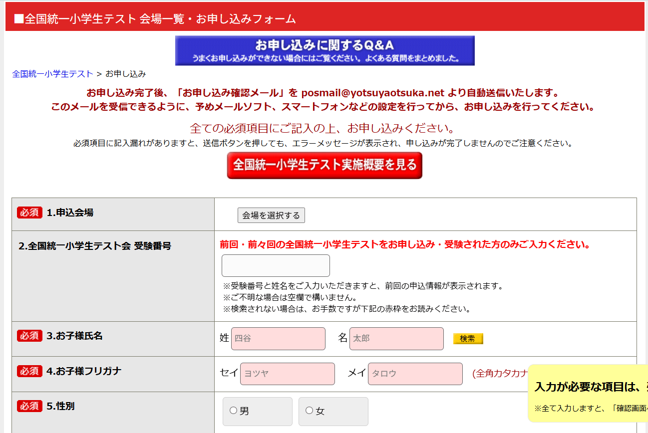 (3)申し込みフォーム画面に移動したら、受験会場、お子様の名前、性別、学校名、生年月日などを記入します。