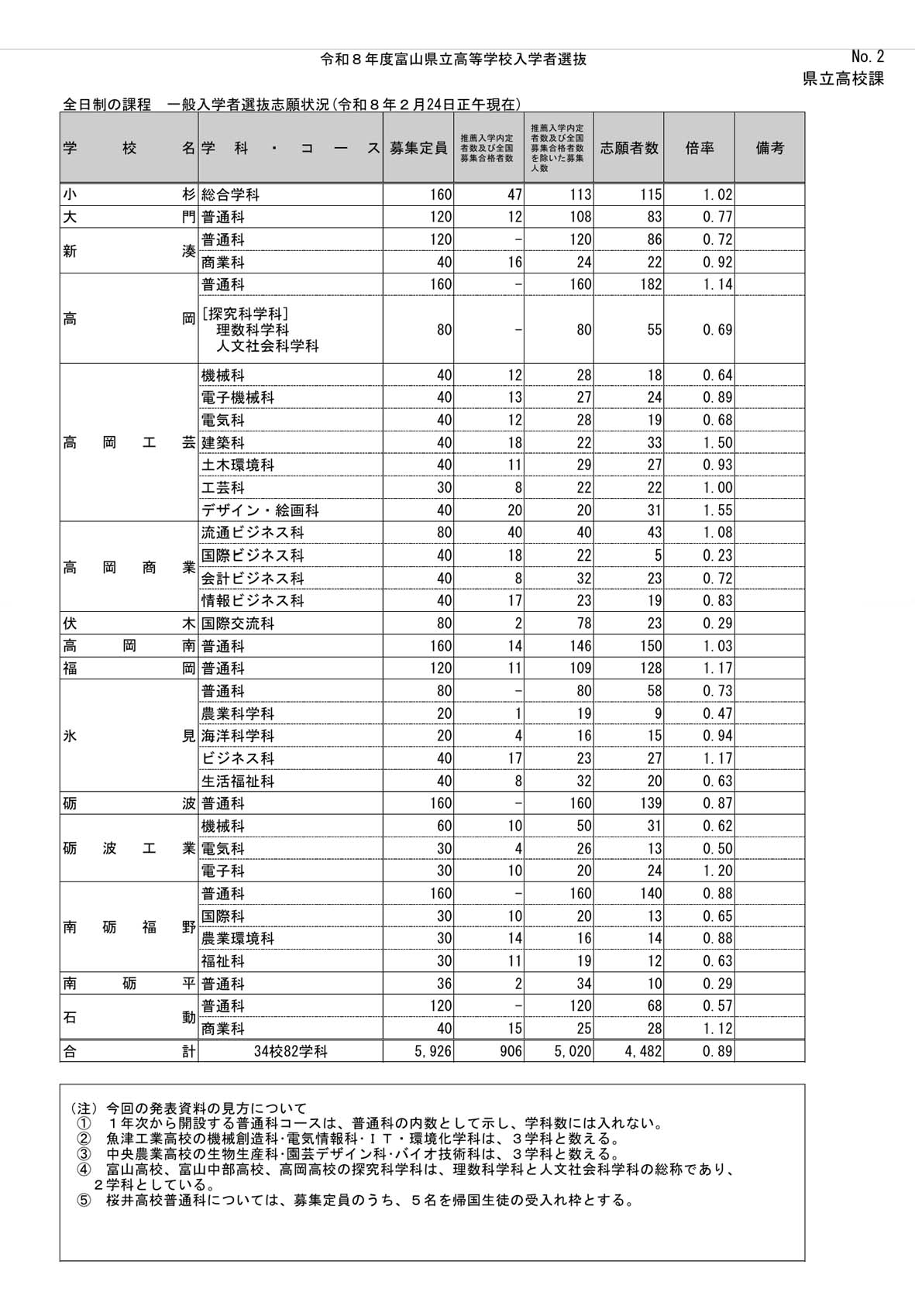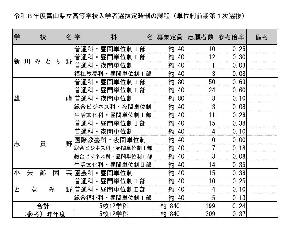 以下、令和8年(2026年)富山県立高校の一般入試倍率をお知らせします。