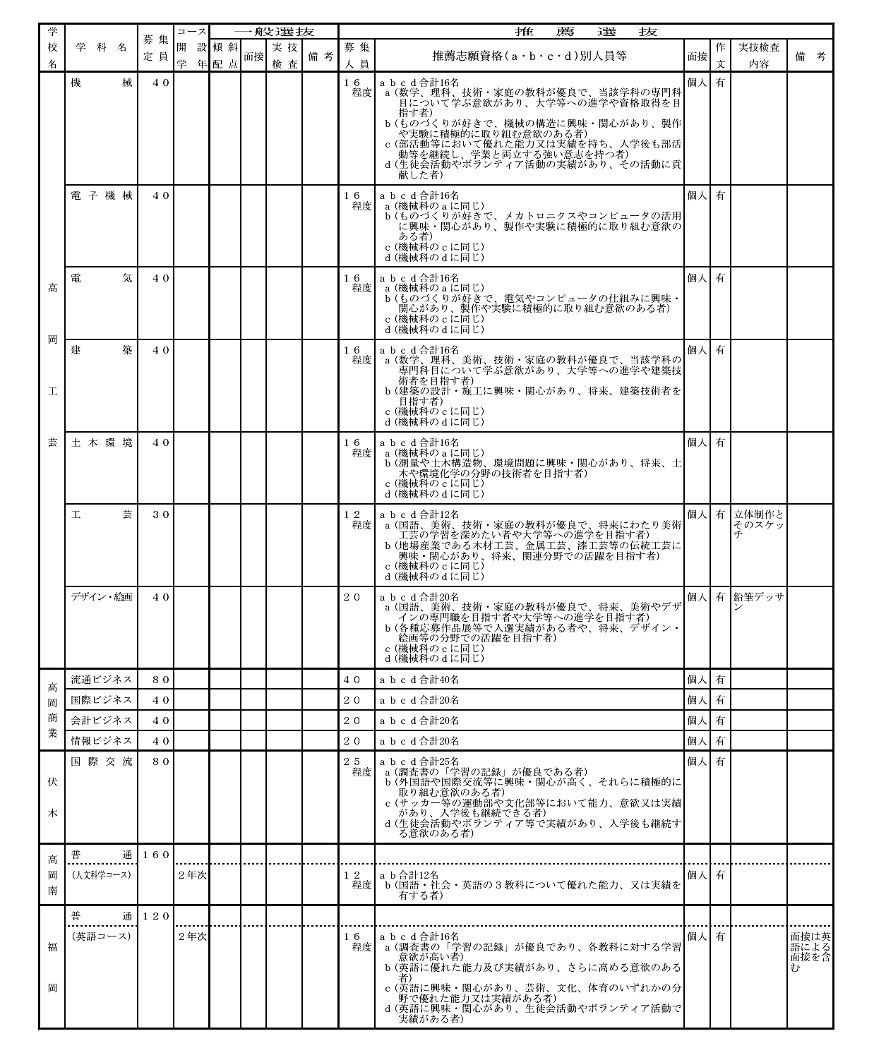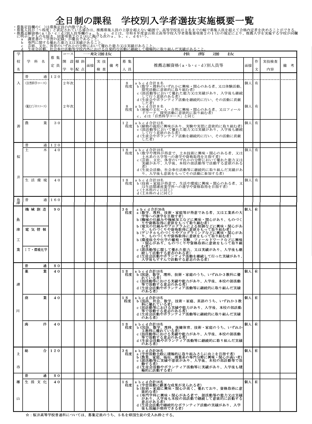 全日制の推薦選抜は、前年度と同じ27校・62学科で実施され、募集人員は合計1,173人(前年度比17人減)となります。
