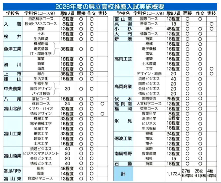 2026年度(令和8年度)富山県立高校推薦入試の募集人数など概要は以下です(2025年10月16日朝刊「北日本新聞」より引用)。