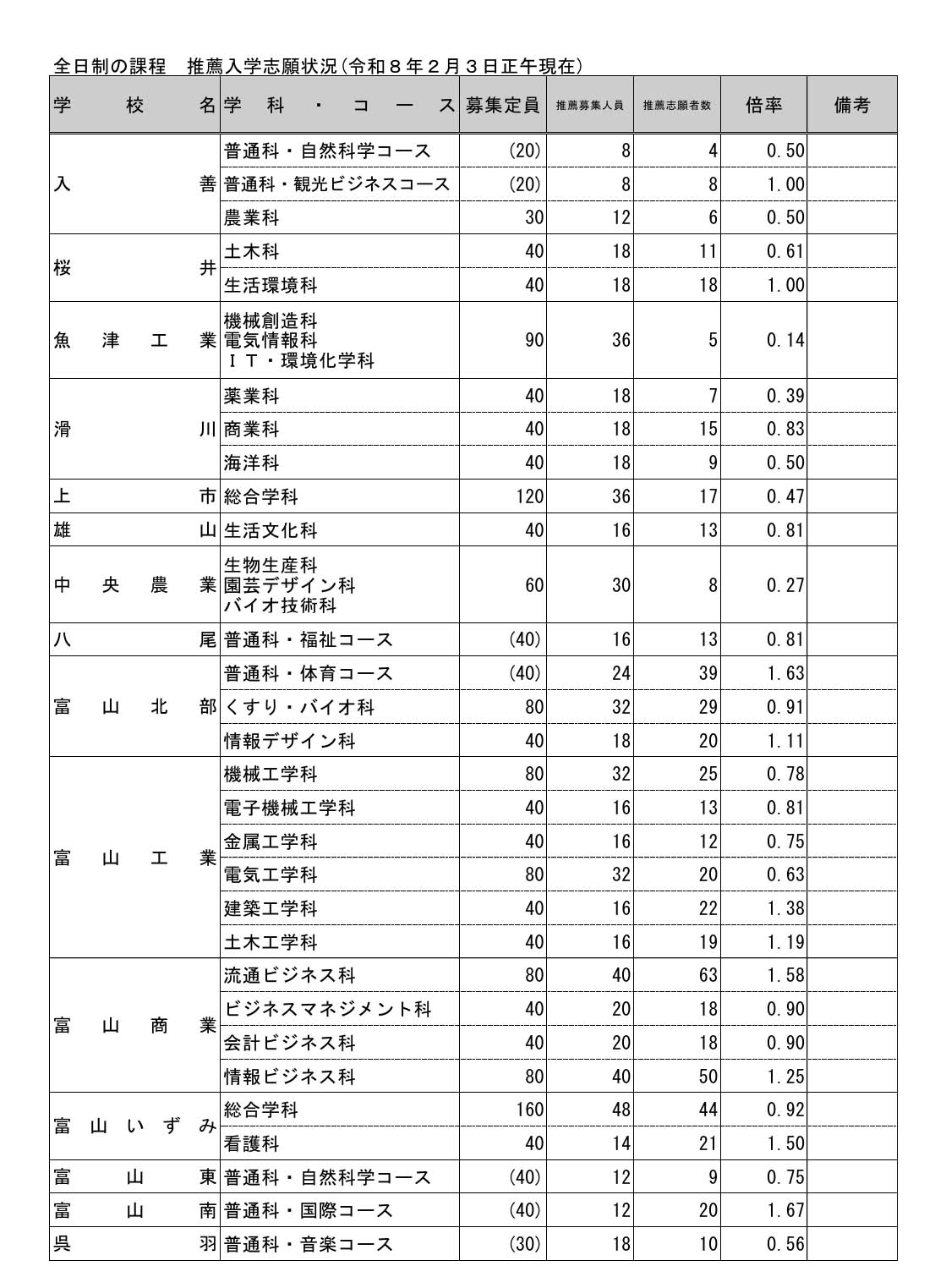 令和8年(2025年)の富山県立高校推薦倍率が、「富山県教育委員会」のwebサイトにて公開されました。