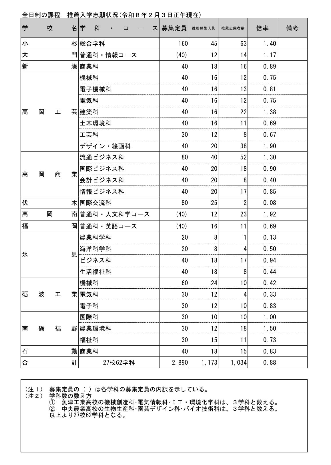 令和8年(2026年)の推薦入試は、27校63学科で募集され、1,034人が志願しました。