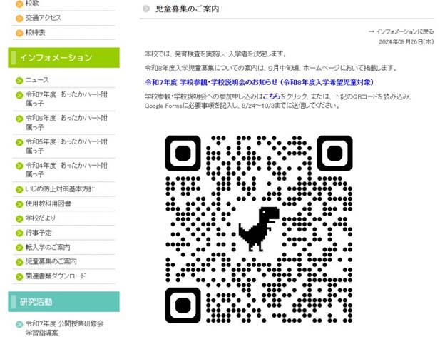 (2)「児童募集のご案内」ページのQRコード、もしくは文中の青字「こちら」をクリックします。