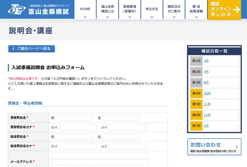 (3)申込フォームが出てくるので、「入試準備説明会お申込フォーム」に必要事項を記入します。