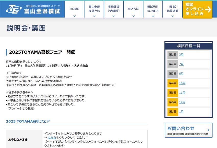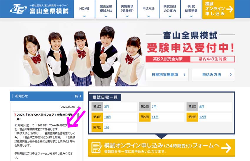(1)富山全県摸試のホームページにアクセスして、「お知らせ一覧」にある『2025 TOYAMA高校フェア「申込フォームはこちら」』をクリックします。