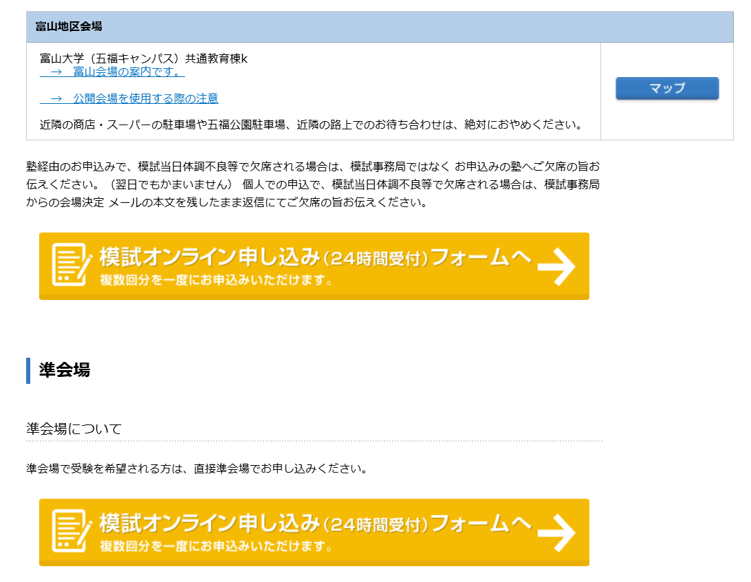 (2)画面を下にスクロールさせて「模試オンライン申し込み」の黄色いボタンをクリックします。