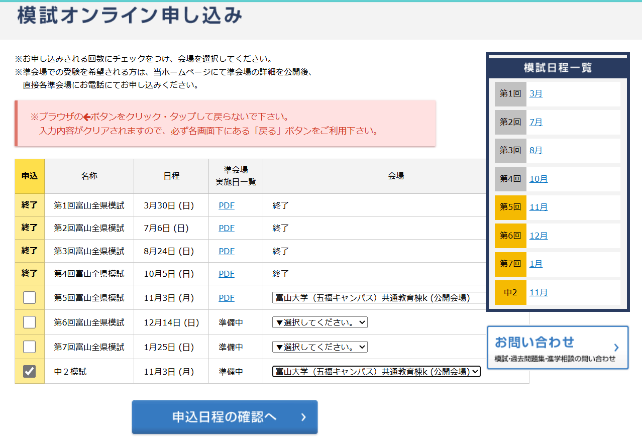 受験会場も選んで「申し込み日程の確認へ」ボタンをクリックしてください。