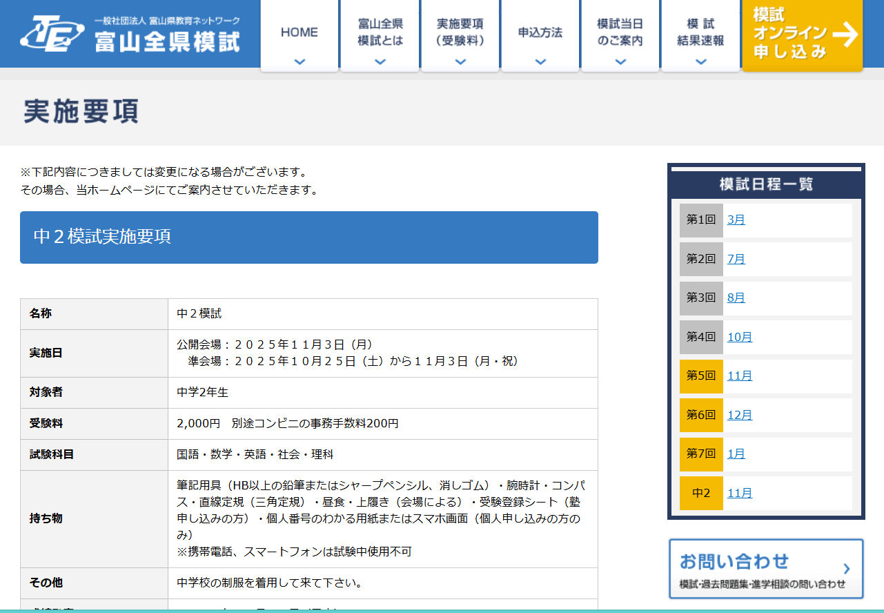 中学2年生現時点での実力を測ることができる「富山全県中2テスト」が11月に行われます。