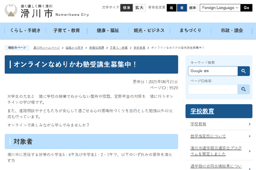 富山県滑川市で実施されている、小・中学生向けの無料オンライン学習支援事業「オンラインなめりかわ塾」についてまとめました。