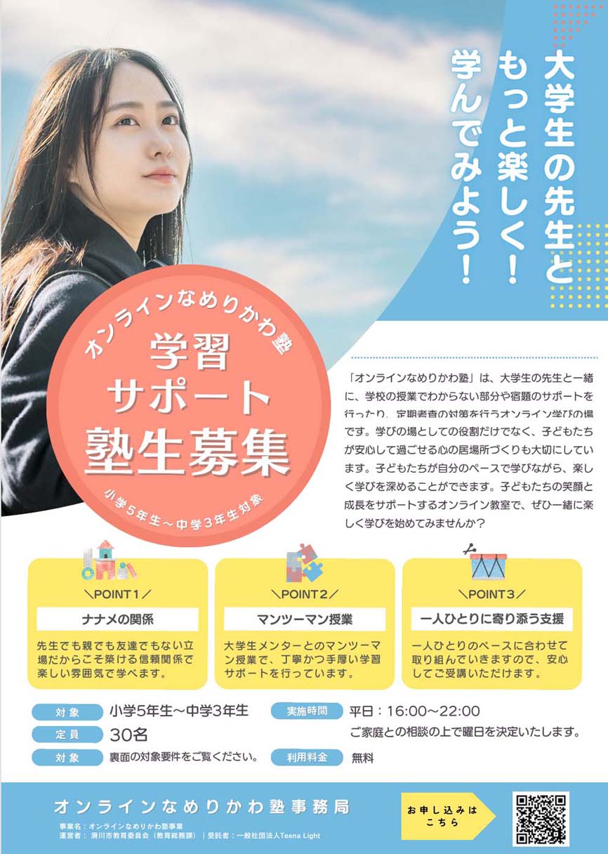 「オンラインなめりかわ塾」は、滑川市が運営し、オンライン学習塾を運営する富山の企業、「一般社団法人Teena light」が受託している、無料のオンライン学習塾です。
