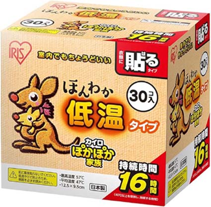 アイリスオーヤマの「使い捨て低温カイロ 衣類に貼るタイプ」は、平均温度47℃、最高温度で57℃と、優しい暖かさで体を温めてくれます。