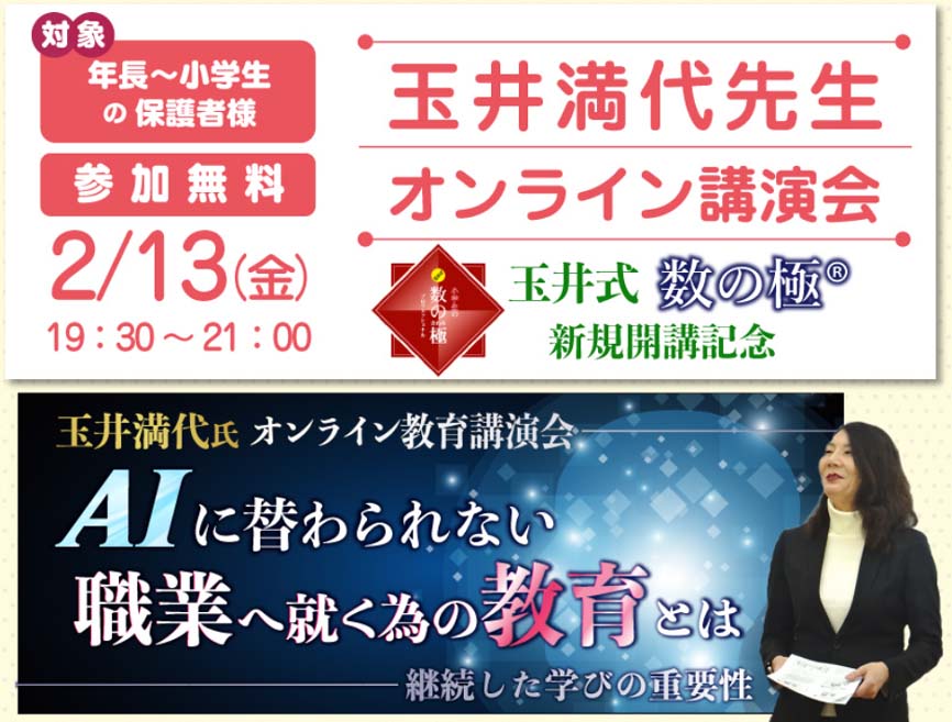 講演会は、塾の指導に「玉井式 国語的算数」を取り入れている、「富山育英センター」主催で行われます。