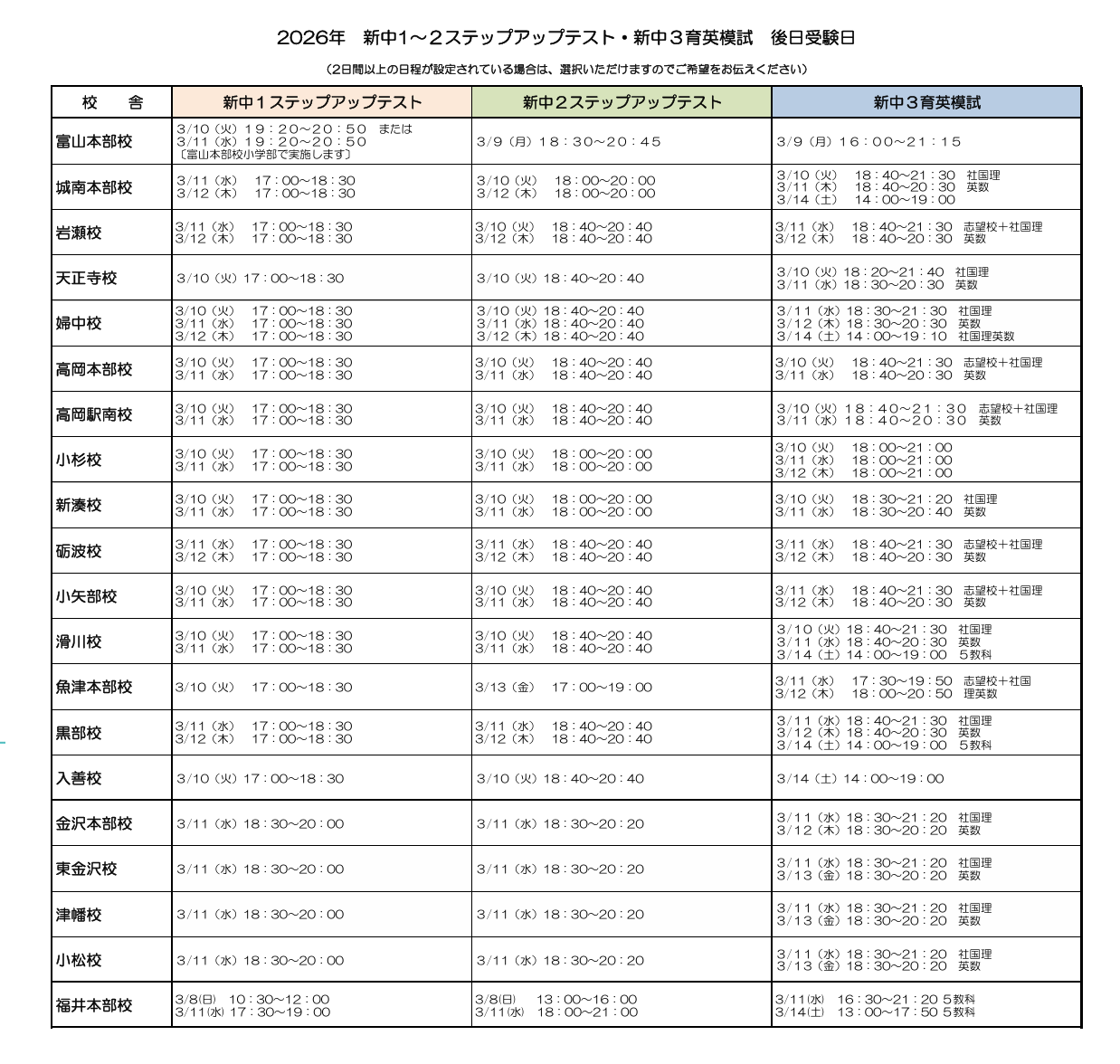●新中3で「富山本部校中学部」を選択した場合、試験会場は3月8日のみ「富山県農協会館」となります。