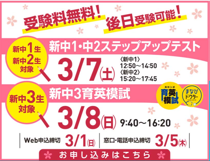 ぜひ「新中1・中2ステップアップテスト」「新中3育英模試」を受けて、受験に向き合う気持ちを高めて下さいね。