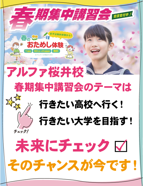 アルファ進学スクール桜井校の春期講習会テーマです!
