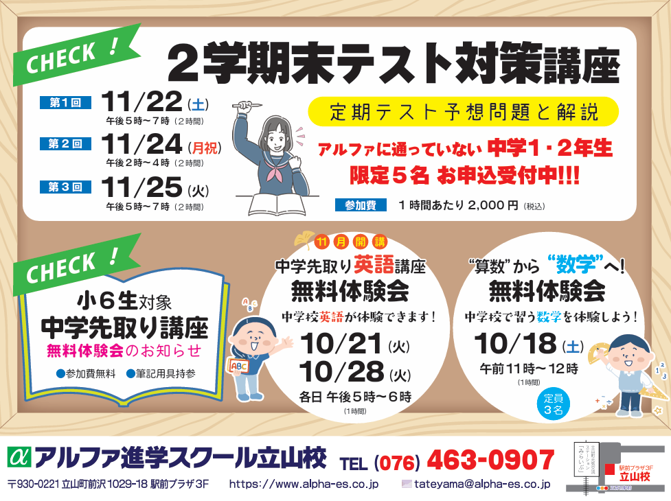 立山校では、小学6年生を対象に中学先取り無料体験会を行います。中学って小学校とどうちがうの?一足早く体験して、不安を解消いたしましょう!