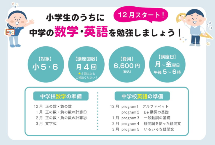 小学6年生は中学入学まで4か月となる12月からの講座です。