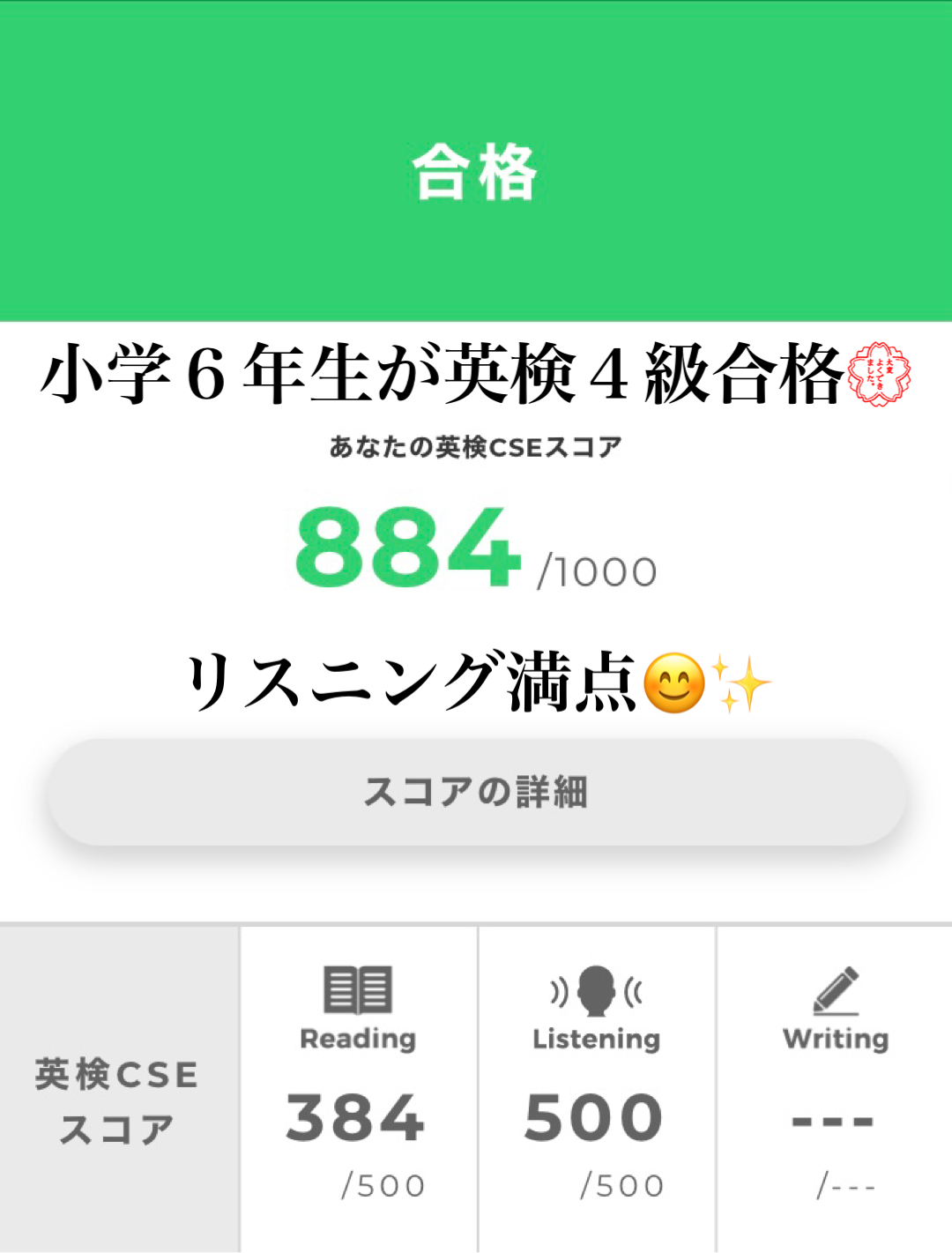 当塾の小学6年生の生徒が英検4級にリスニング満点で合格しました!