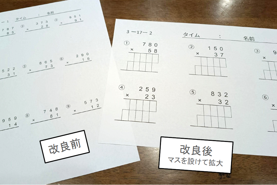 計算プリントの計算式一つひとつにマスを設け、