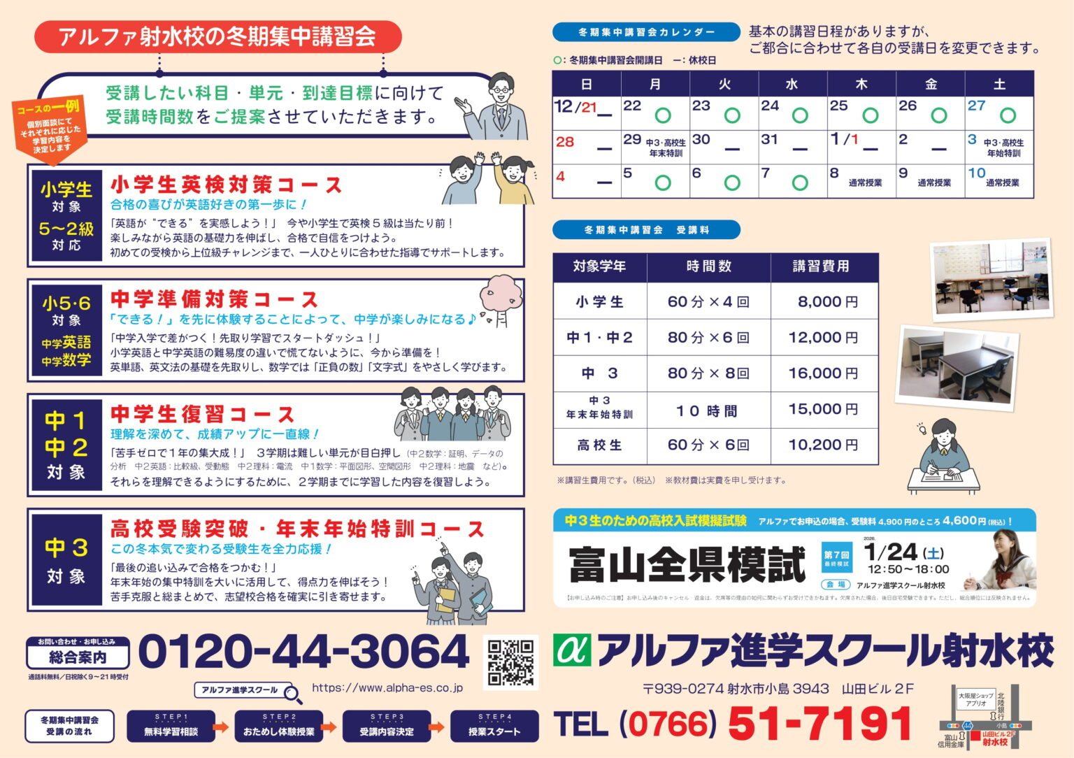 アルファ進学スクール射水校では、この冬休みに「冬期集中講習会」を開講し、皆さんの学力アップと自信づくりを全力でサポートいたします(*^^)v