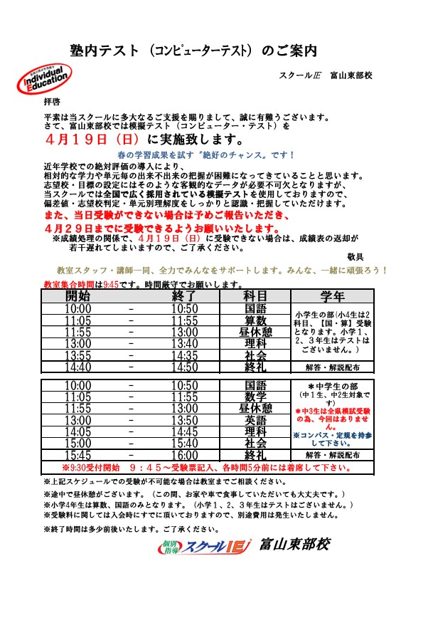※再度明日の小4〜中2生対象の塾内テストの日程を載せておきます!