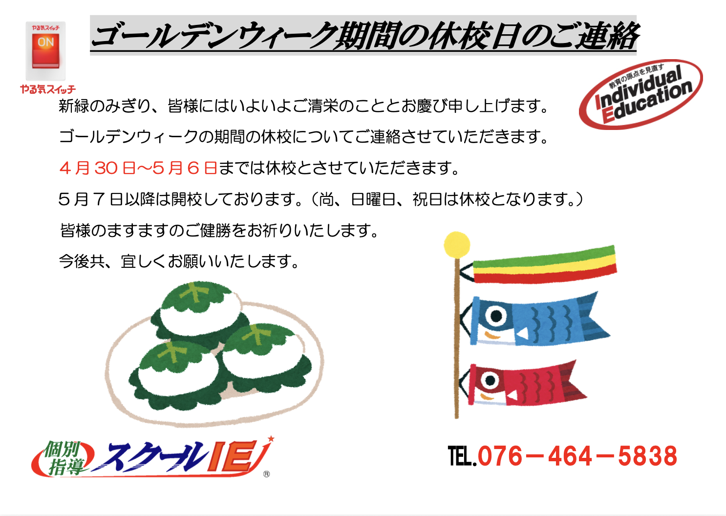 来週、4月30日(木)〜5月6日(水)は、教室はゴールデンウィーク休みに入ります。