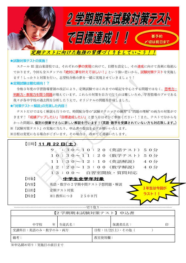 そして来週の土曜日、11月22日には恒例の【定期試験対策テスト】を実施します!