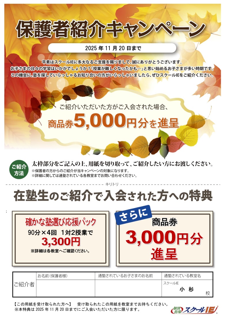 現在、小杉校では 保護者紹介・兄弟紹介キャンペーン 秋の入塾キャンペーン を実施しております!