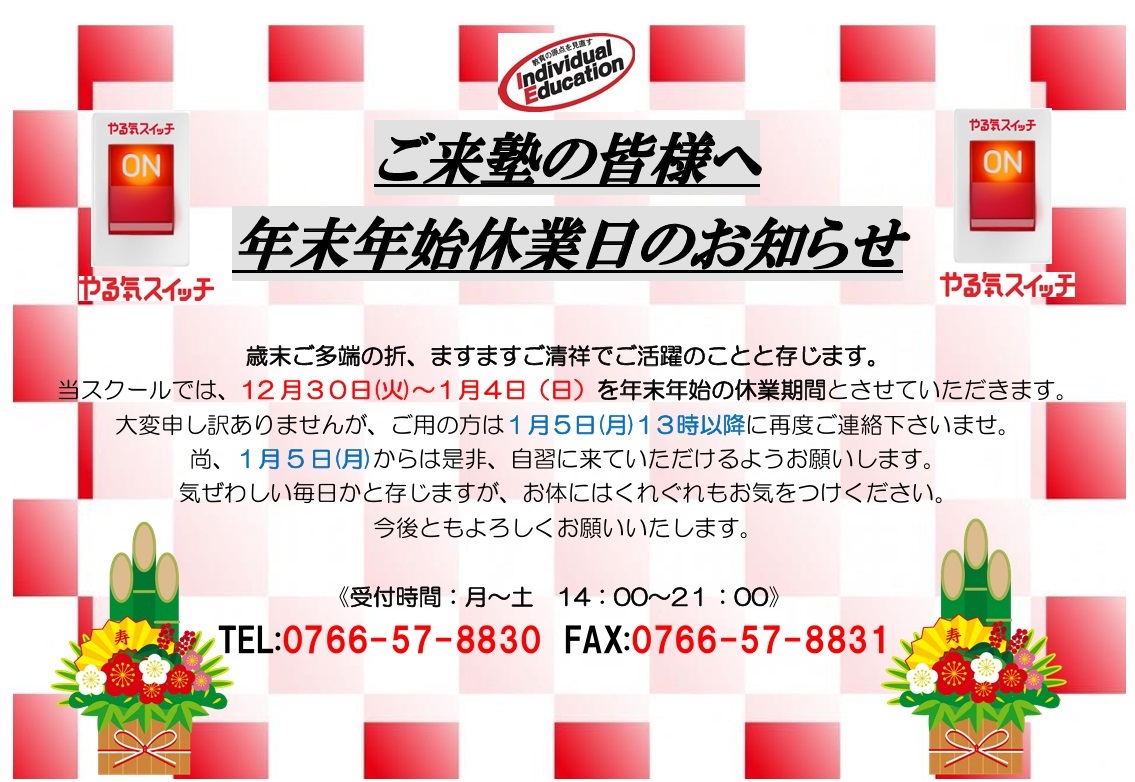 12/30(火)〜1/4(日)は、休校となります。 よろしくお願いいたします。