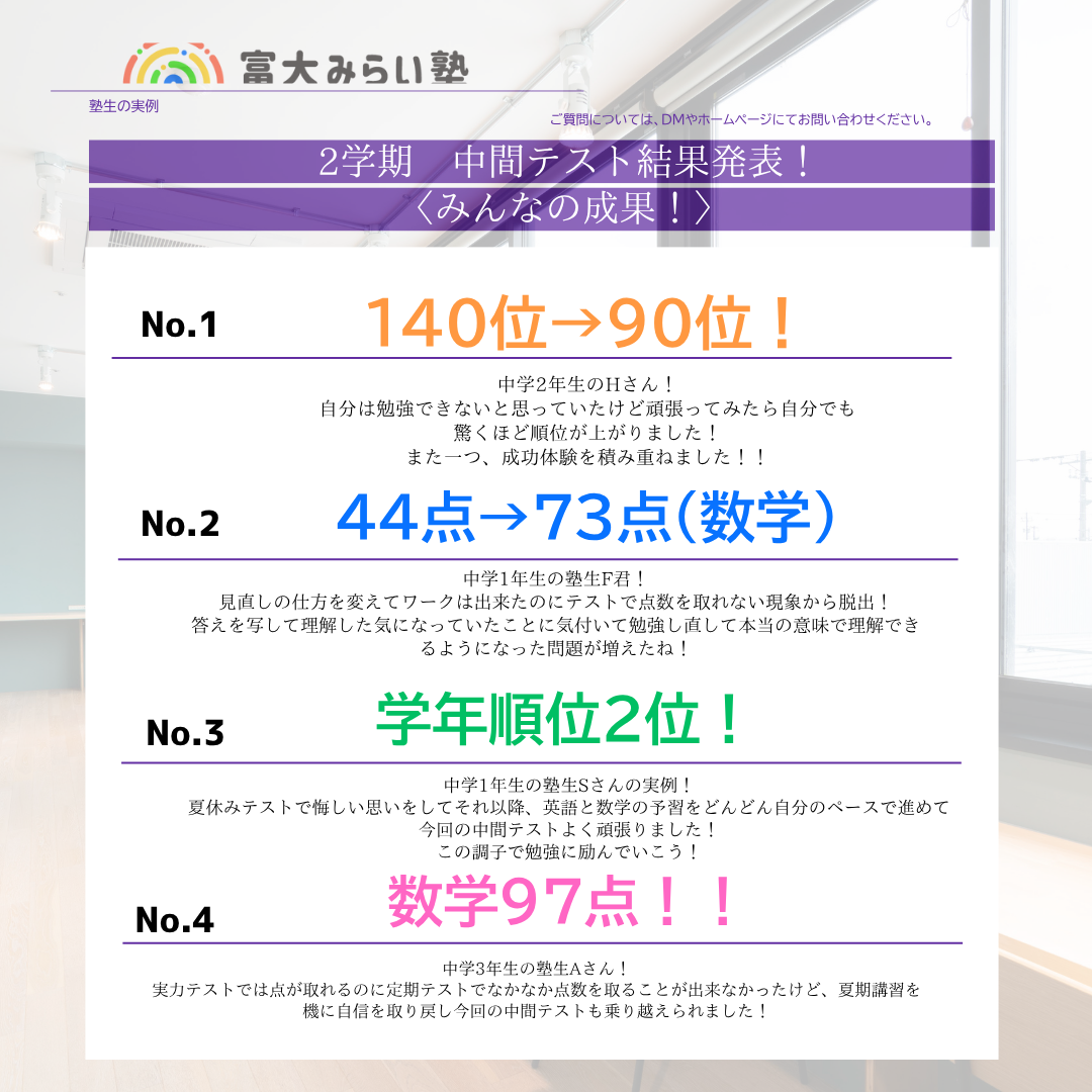 そのため、結果に出ているように元々成績が良い生徒も平均点を取れなかった生徒も成績を伸ばしています!