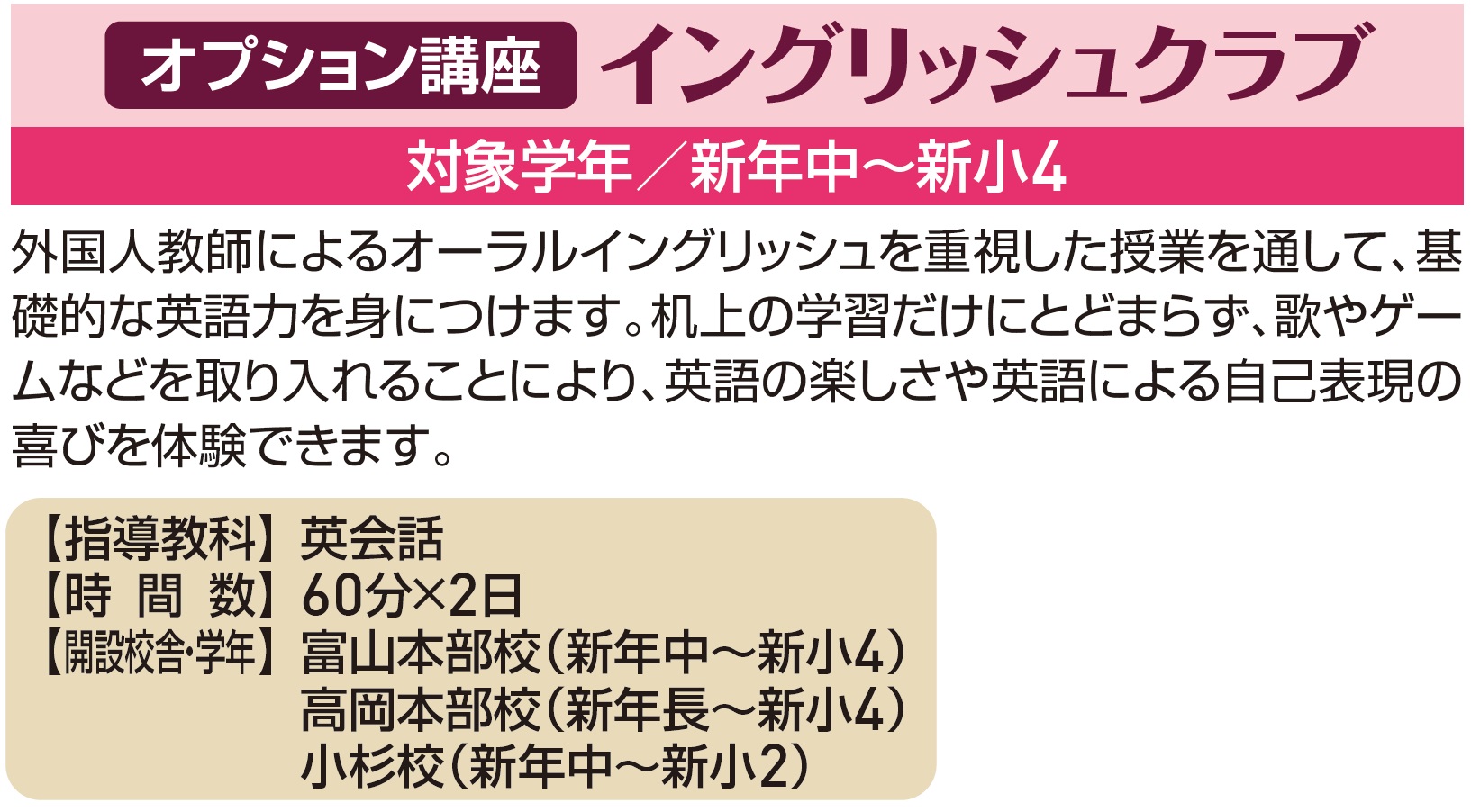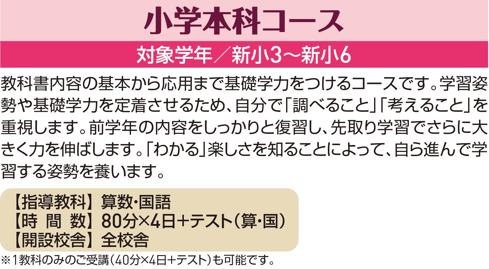 ※以下にご紹介するコースの日程・時間は,富山本部校小学部でご受講の場合です。校舎によって開講状況などが異なりますのでご了承ください。