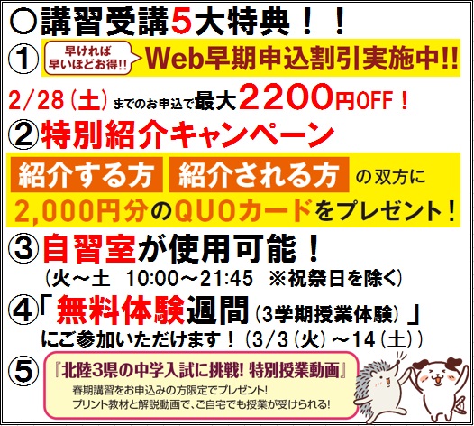 春期講習をお申込の方に,「北陸3県の中学入試問題」を抜粋したプリントをプレゼント!