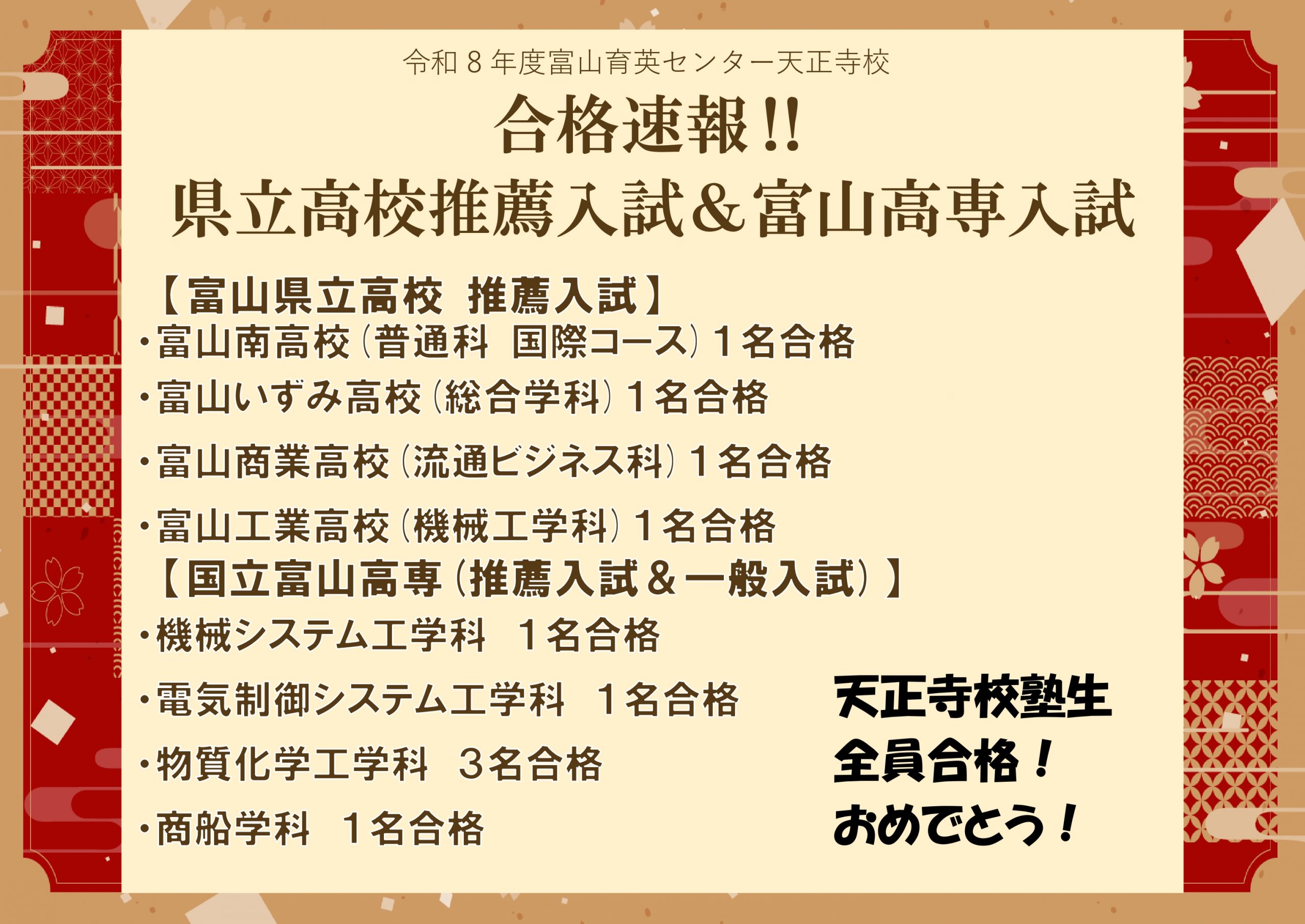 さて、先日行われた県立高校推薦入試と富山高専入試の結果をご報告いたします。
