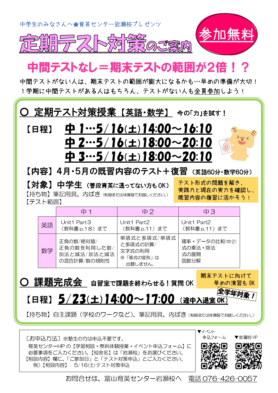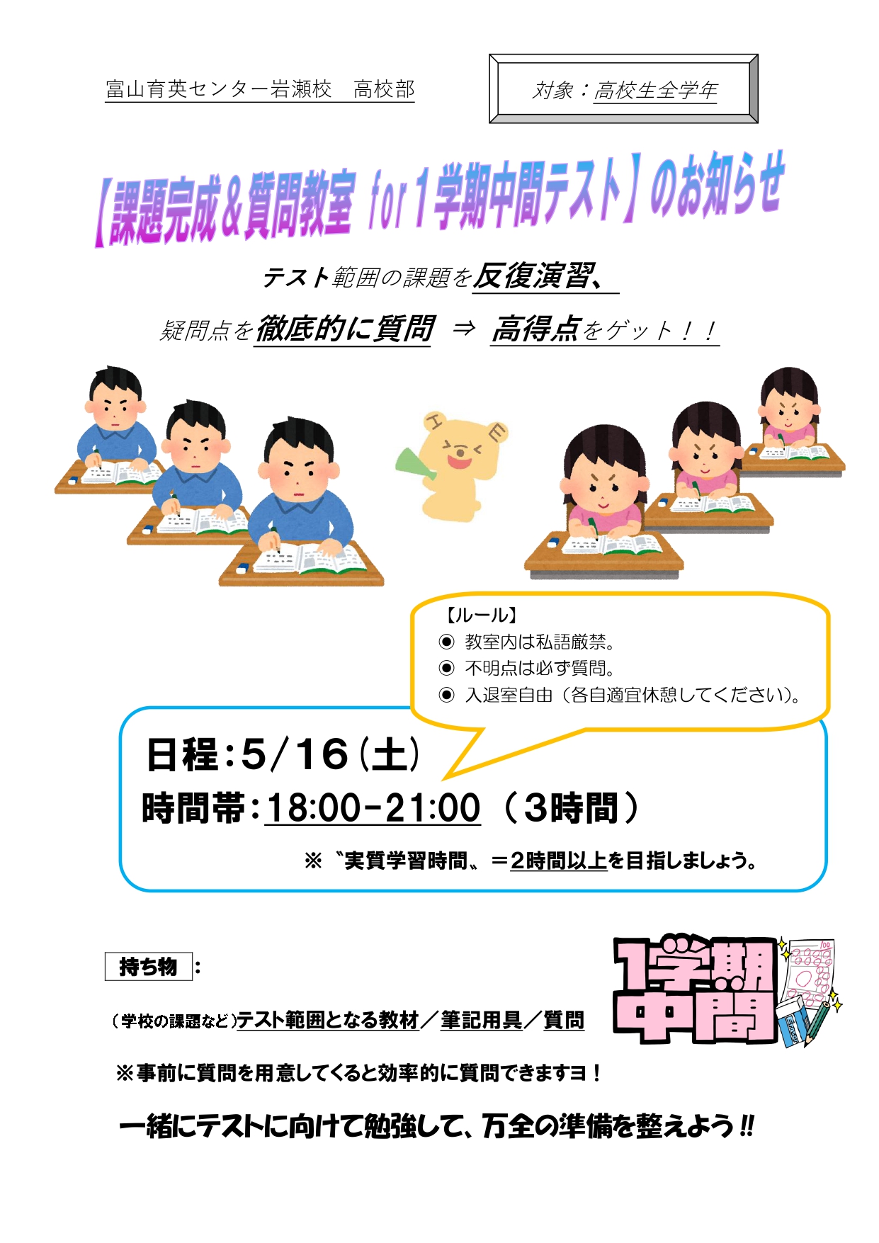 【中学生・高校生対象】中間テスト対策を5/16(土)に行います。