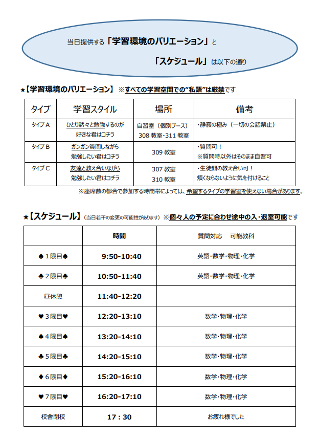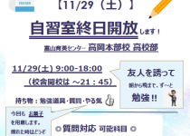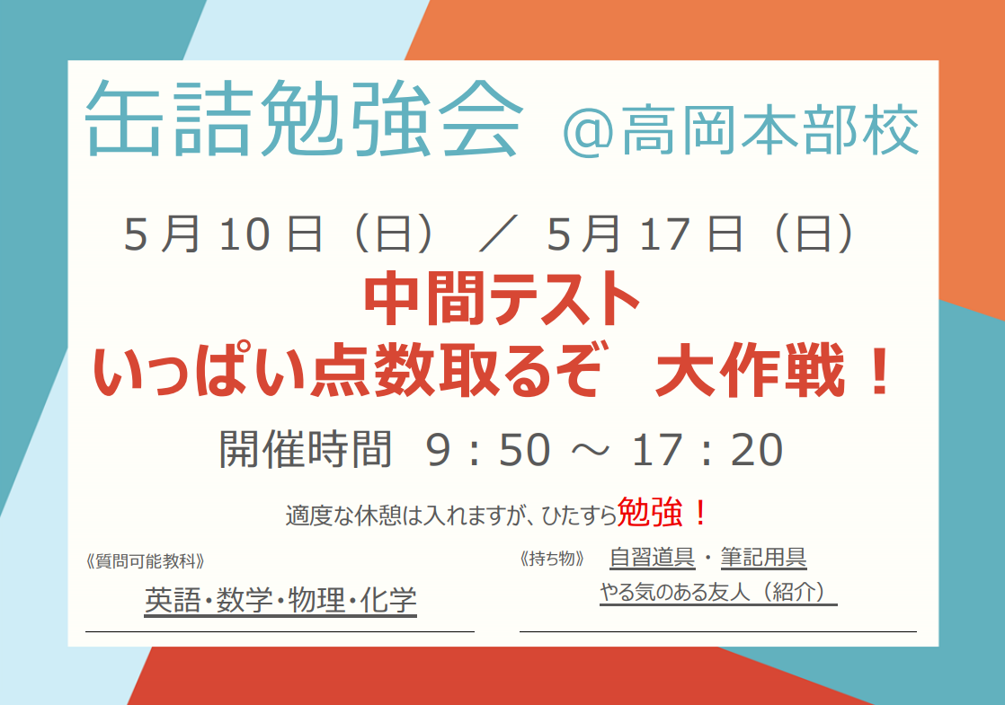 高岡本部校では1学期中間テストに向け、5/10(日)・5/17(日)に『缶詰勉強会』を開催します。