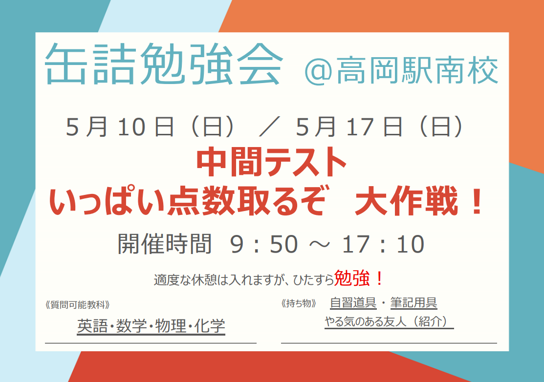 高岡駅南校では1学期中間テストに向け、5/10(日)・5/17(日)に『缶詰勉強会』を開催します。