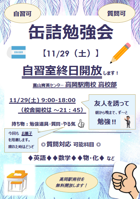高岡駅南校高校部では11/29(土)に期末テストに向け、『缶詰勉強会』を開催します!
