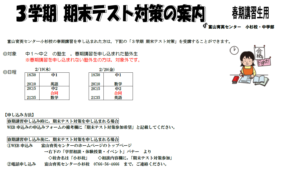 春期講習申込みの方は,この期末テスト対策授業に参加できます。