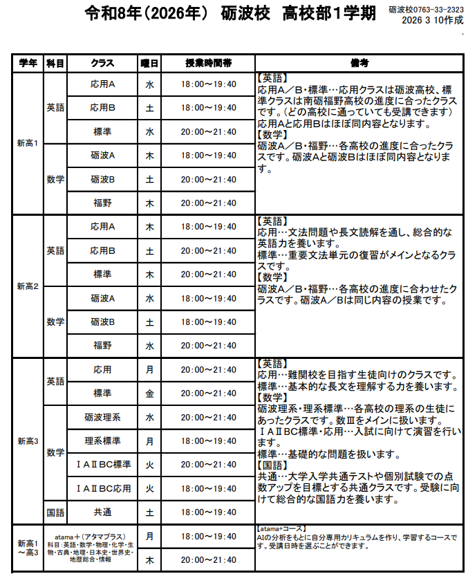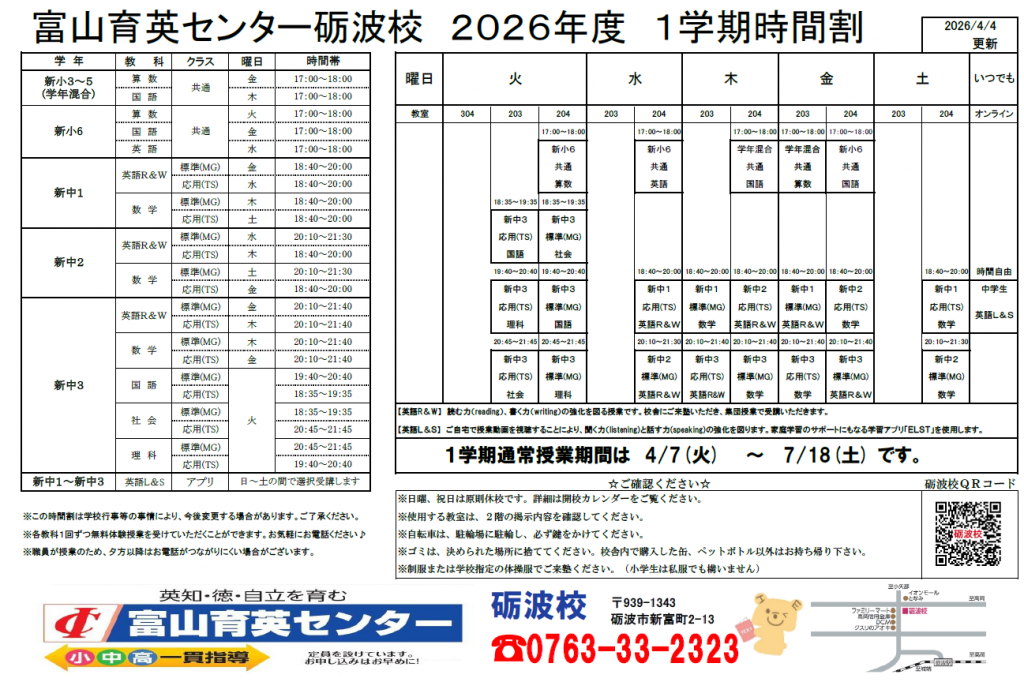 さて、砺波校では小学生・中学生が4月7日(火)、高校生が4月8日(水)より1学期授業を開始いたします。