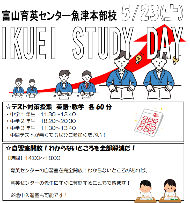 魚津本部校では5/23(土)に【IKUEI STUDY DAY】を開催します。