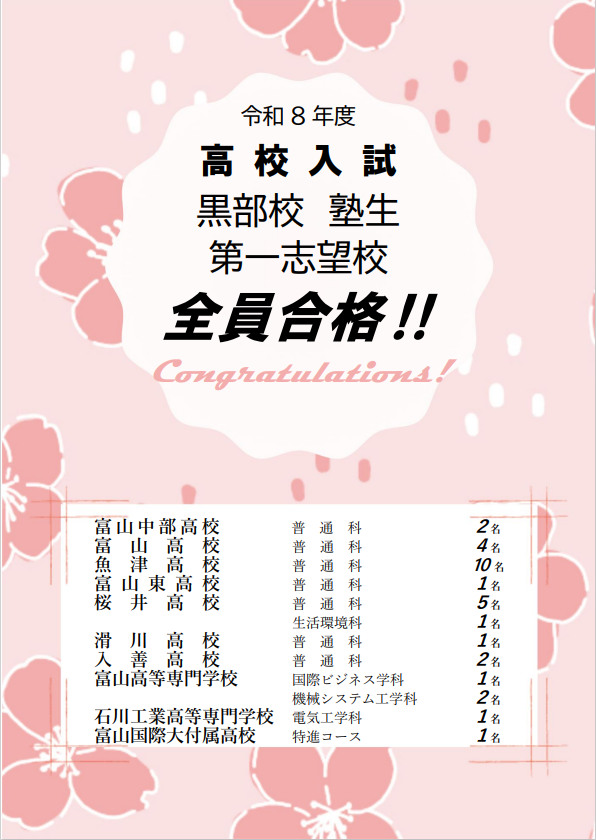 他にも富山中部高校や魚津高校といった進学校や、地元の桜井高校も自信と実力をもって輩出しております!