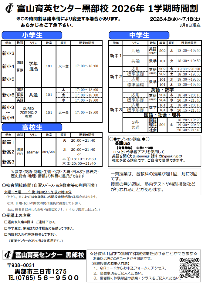 興味を持っていただいた方はぜひ無料体験授業をご検討ください。(下に時間割があります。)